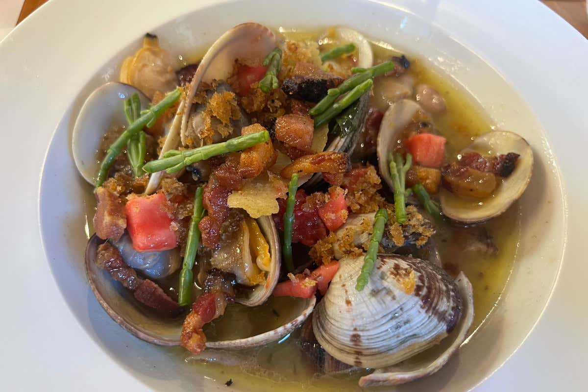 ABC: vongole veraci con guanciale affumicato, borlotti, salicornia e pangrattato