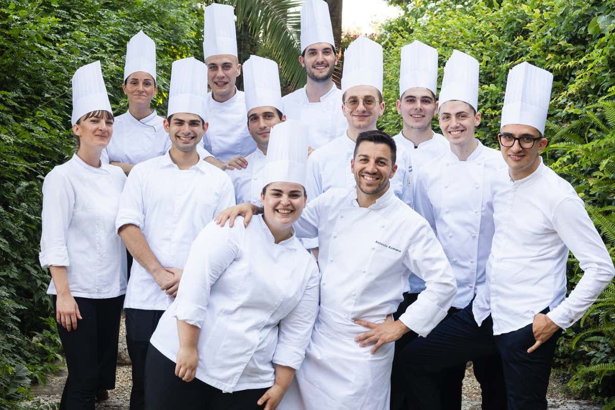 Ed è allora che arriva l’occasione da Villa della Pergola: «Stavo per firmare un altro contratto, poi mi ha scritto Francesca (Ricci ndr), la restaurant manager. Vengo a vedere il posto, era febbraio, pioveva, ma ho capito subito il potenziale. Per me è stata una nuova sfida passare a un contesto alberghiero dove ci si occupa anche di colazioni, room service e light lunch. Ma una dimensione più ampia ti permette di osare, anche nel fine dining. Puoi sognare pur mantenendo i piedi per terra». Romano ha costruito da zero anche la brigata: «Non ho portato nessuno con me, ho preferito selezionare le persone giuste, non solo competenti. Ho fatto tutto in incognito, pubblicando annunci senza svelare la destinazione. In due settimane ho trovato 13 persone. E la cosa più bella è che oggi c’è squadra, armonia».
