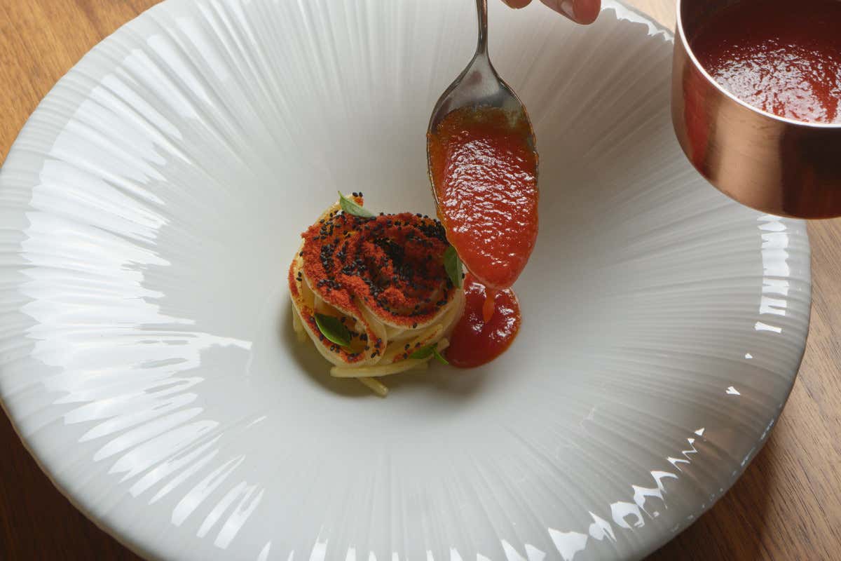 Niente a che vedere con i frutti standardizzati dell’industria moderna: qui si parla di memoria gustativa, di sapore ancestrale, di un frutto che sa di terra, di sole e di casa. Chef Lanuto lo lavora con rispetto, lo sublima senza mai snaturarlo. In un suo piatto iconico - che potremmo definire una “pomodopera” contemporanea - il pomodoro millenario viene servito in tre consistenze: crudo a carpaccio con olio di limone amalfitano, in gelatina affumicata con foglia di cappero croccante, e in salsa calda emulsionata con colatura di alici di Cetara. Un’ode alla mediterraneità che danza tra morbidezze e contrasti, freschezze e umami, con un finale iodato che ricorda il respiro del mare.