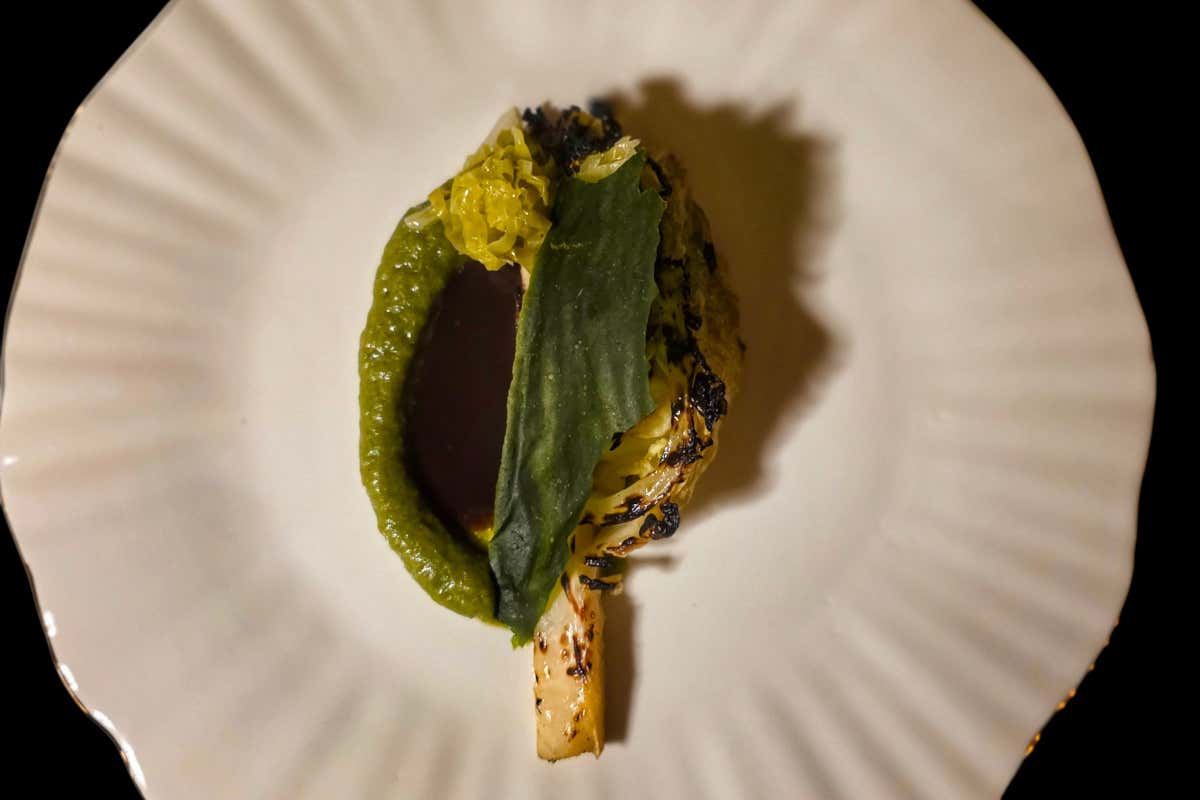 Una cena di grande bontà, quella dedicata al venticinquesimo compleanno di Ophis, con amuse-bouche golosi e un inizio notevole con il lesso: uno squisito bollito di testina d’agnello servito con misticanza e salse. Ancora, l’arrosto di verza, rigoroso piatto vegetale dalle intense sfumature minerali. Di bontà assoluta un evergreen di Citeroni, la pasta “con il nostro raccolto”: «con un estratto di bietola selvatica si va a mantecare la pasta, che viene condita con un'insalata di erbe aromatiche senza regola, con tutta la diversità che la stagione porta con sé. Uniamo solo olio extravergine di oliva e mantechiamo il formato che un pastificio realizza per noi. I gambi della bietola vengono marinati sottovuoto in aceto di riso per almeno una settimana e li utilizziamo come dadolata».