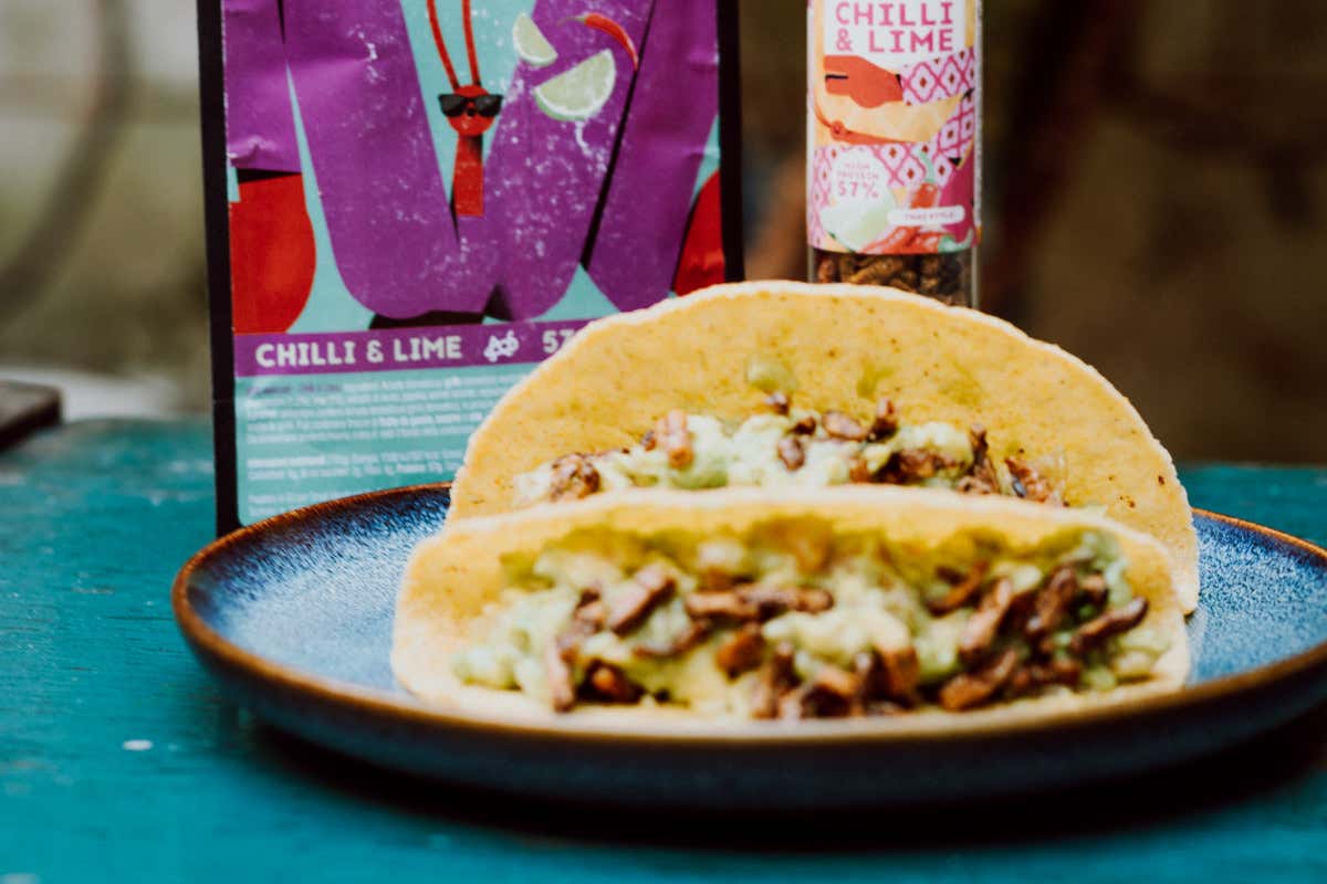Tacos con guacamole e grilli al chili e lime