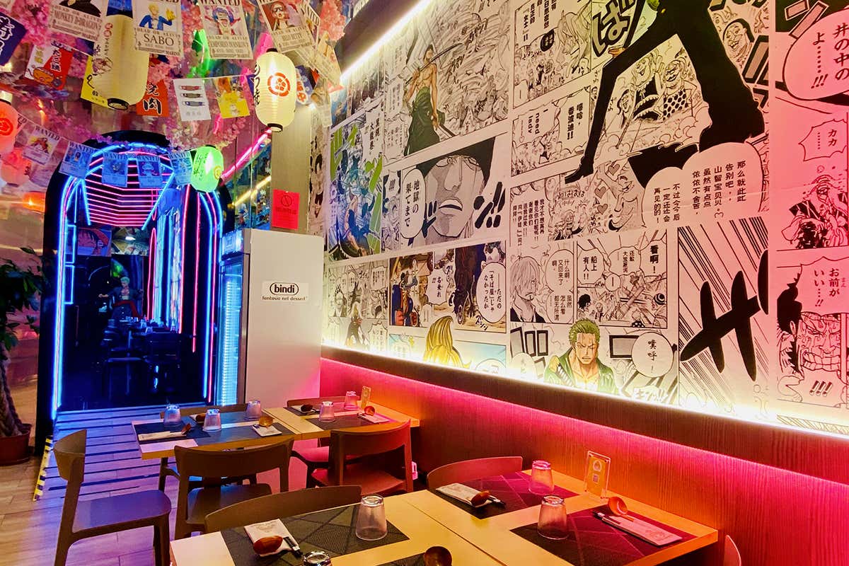 Sulla stessa linea si muove Beika Ramen a Mano, in via Nizza, che, come in un grande luna park, richiama esplicitamente l’estetica anime e il racconto visivo tipico della cultura pop giapponese.