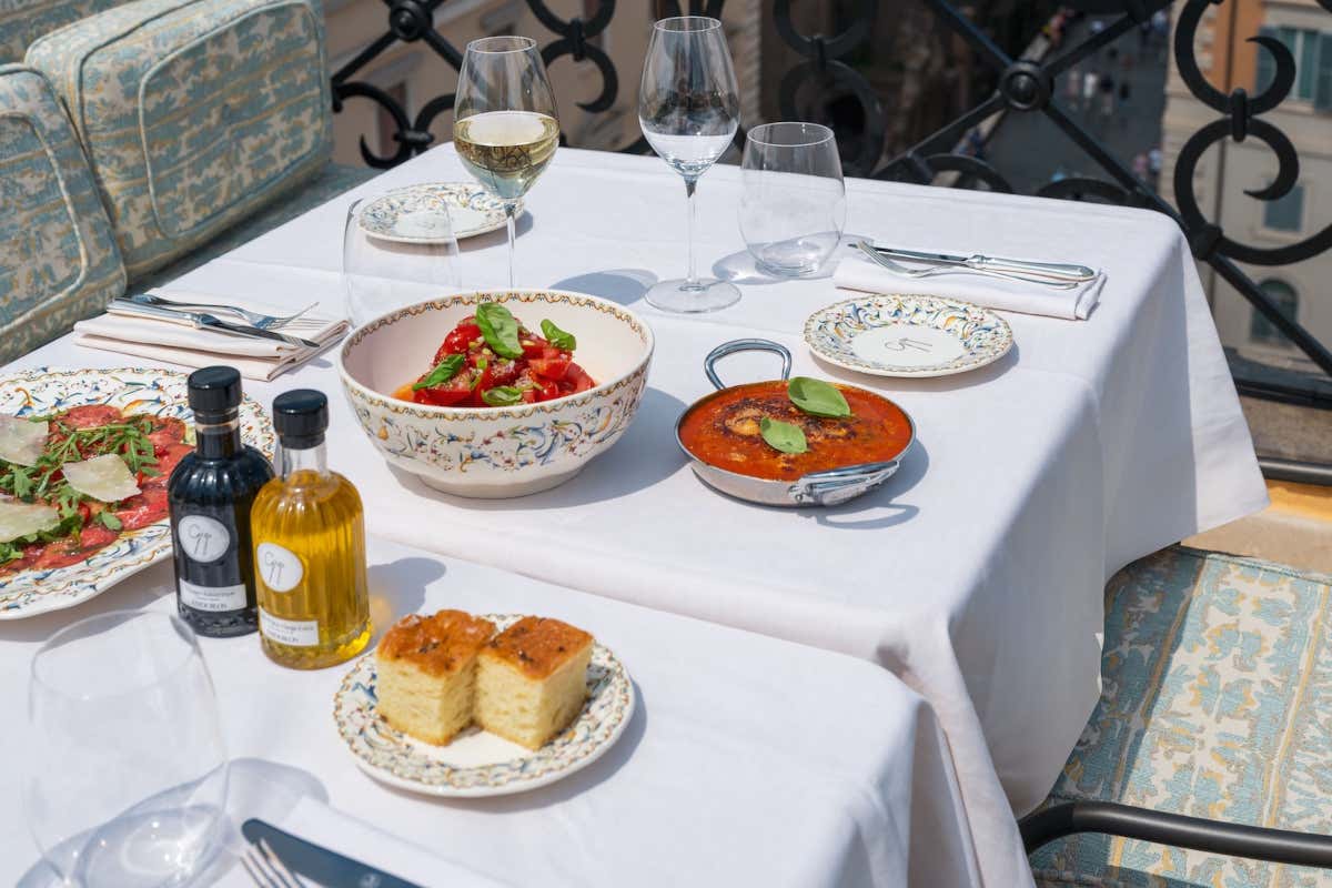 Ed ora, dopo la completa ristrutturazione della terrazza e del ristorante, è stata festa grande, al settimo piano, con personaggi famosi e vip accolti sul red carpet e 300 ospiti in dress code chic elegant, come precisato nell'invito. Arredi in legno e marmo, tanto verde e un'allegra orchestra hanno celebrato l'evento, ma la scena se l'è presa il Pantheon, con la sua cupola che andava tingendosi di rosa al tramonto, perfetta e integra come duemila anni fa. Ogni dettaglio, così come nella parte interna del ristorante, è stato pensato per esprimere lo spirito della Dolce Vita, in chiave urbana e cosmopolita. Al bancone del Bellini Bar, con vista sull’Altare della Patria, i barman erano impegnatissimi a servire l'iconico cocktail veneziano e Champagne, mentre i camerieri fendevano la folla con plateau di ostriche.