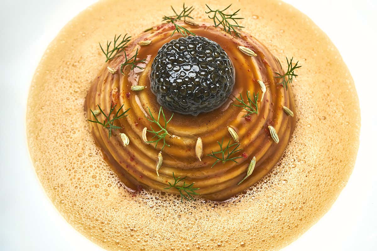 OMAGGIO A SOLIVERES: Turbante di Spaghetti di Gragnano con astice blu bretone finocchio e caviale oscietra