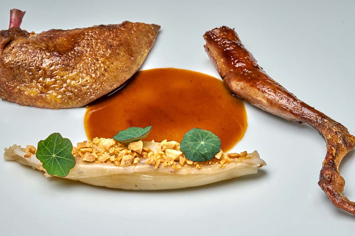PICCIONE: petto e coscia farcita alla brace, indivia belga cotta in succo di calamansi, guanciale e arachidi salate