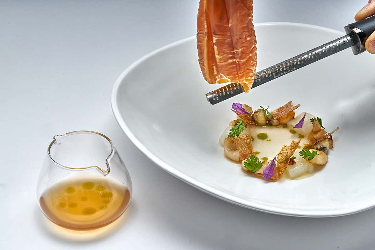 QUINTESSENZA: Calamaro del nostro mare crudo fritto essiccato fermentato e alla brace