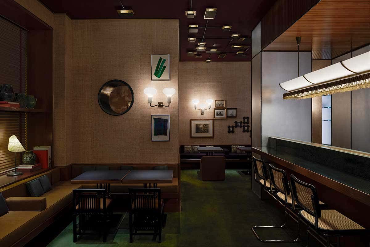 A livello di layout, Langosteria Cucina porta la firma di Dimorestudio che ha pensato a un locale intimo, riservato, domestico ma non per questo meno sofisticato. L'ambiente si richiama al design degli anni Settanta, contaminato con influenze giapponesi. Al centro della sala si trova il bar, che ha come protagonista una lampada vintage lunga circa tre metri in vetro e ottone con frangia perimetrale che sovrasta il bancone in marmo verde. Per creare un’atmosfera lounge, le sedute e i tavoli del ristorante sono state selezionate, e disegnate, più basse rispetto agli standard. L’illuminazione è caratterizzata da una scultura luminosa a soffitto, declinazione della lampada piana Dimoremilano 064, mentre sui muri si trovano le applique vintage Galleria di Ignazio Gardella.