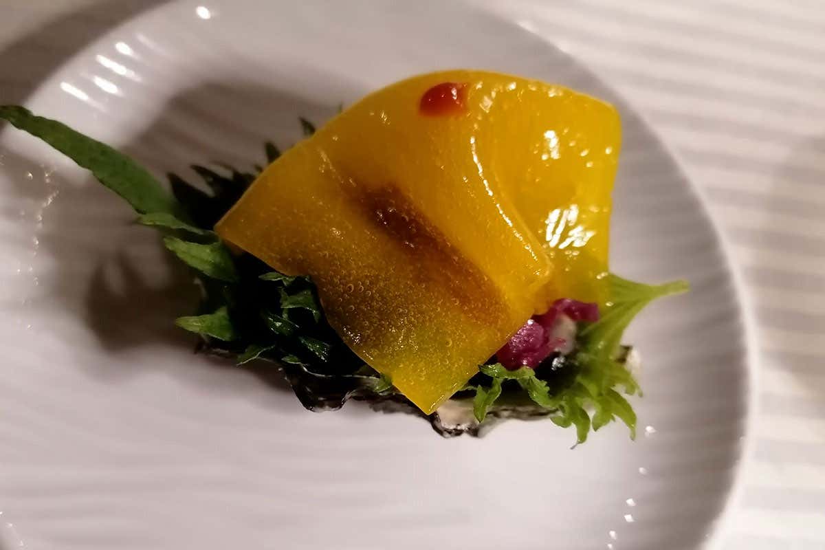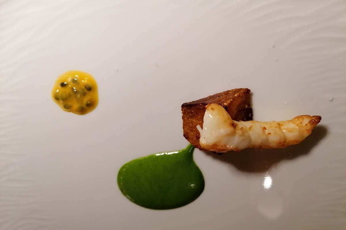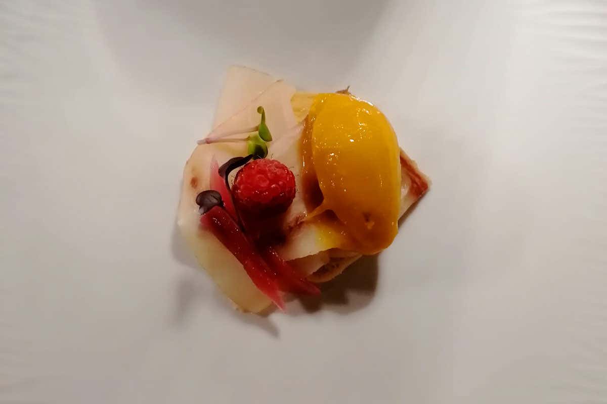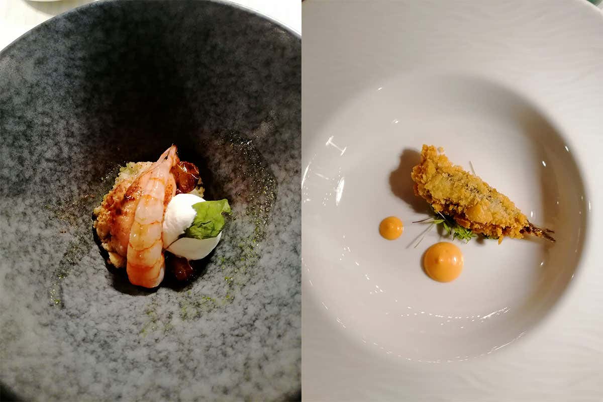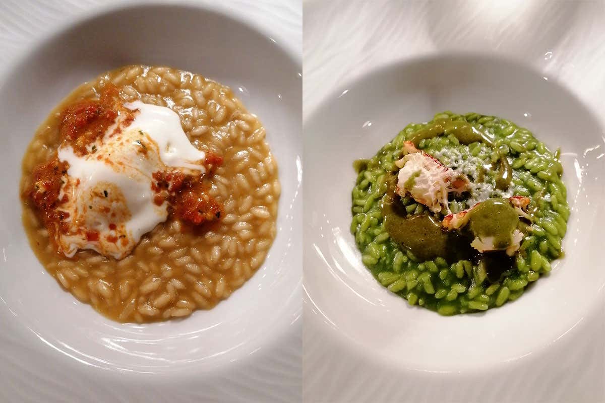 Due portate a base di riso quelle principali: Riso Carnaroli al boraggine con astice bretone, corallo, neve di fior di latte affumicato e riso Carnaroli all'essenza di rosamarino e arancio, con ricci di mare e un gelato alla crescenza. Prima del dolce: Morone con salsa di porri e mele, ceviche di mare, zucca al curry. Poi, appunto, il dolce denominato semplicemente: Bosco.
