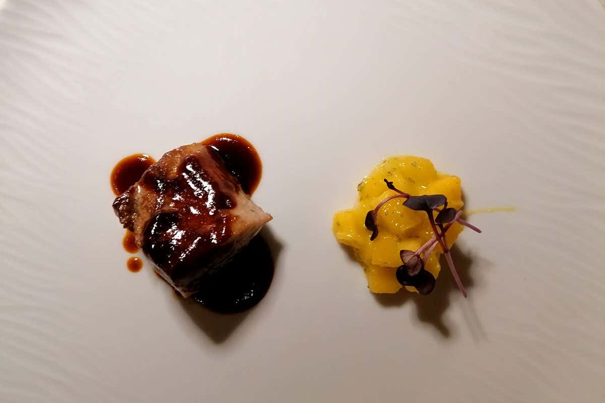 Un incontro tra mare e gelato gourmet, bisogna dire, perchè al fianco di Balgisi in cucina c'era anche il campione europeo di gelateria, Massimiliano Scotti. Otto le portate che fungevano da "aperitivo", ma al termine delle quali già si poteva esprimere un ringraziamento emozionato alla coppia in cucina. Ha aperto le danze Scotti con un Gambero di Oneglia, gelato al pomodoro, spuma di stracciatella con panzanella per poi proseguire con Balgisi e la sua acciuga croccante al verde. Quindi, ecco il gelato: Frollino, semi di finocchio, spada affumicato artigianale, lampone, cipolle in agrodolce, gelato al mango e curry. Ostrica mon amour ha preceduto Pancia di maialino con scampo reale, salsa di rucola e frutto della passione; tonno ancora protagonista con Ventresca di tonno rosso, insalata di mango e proprio fondo.