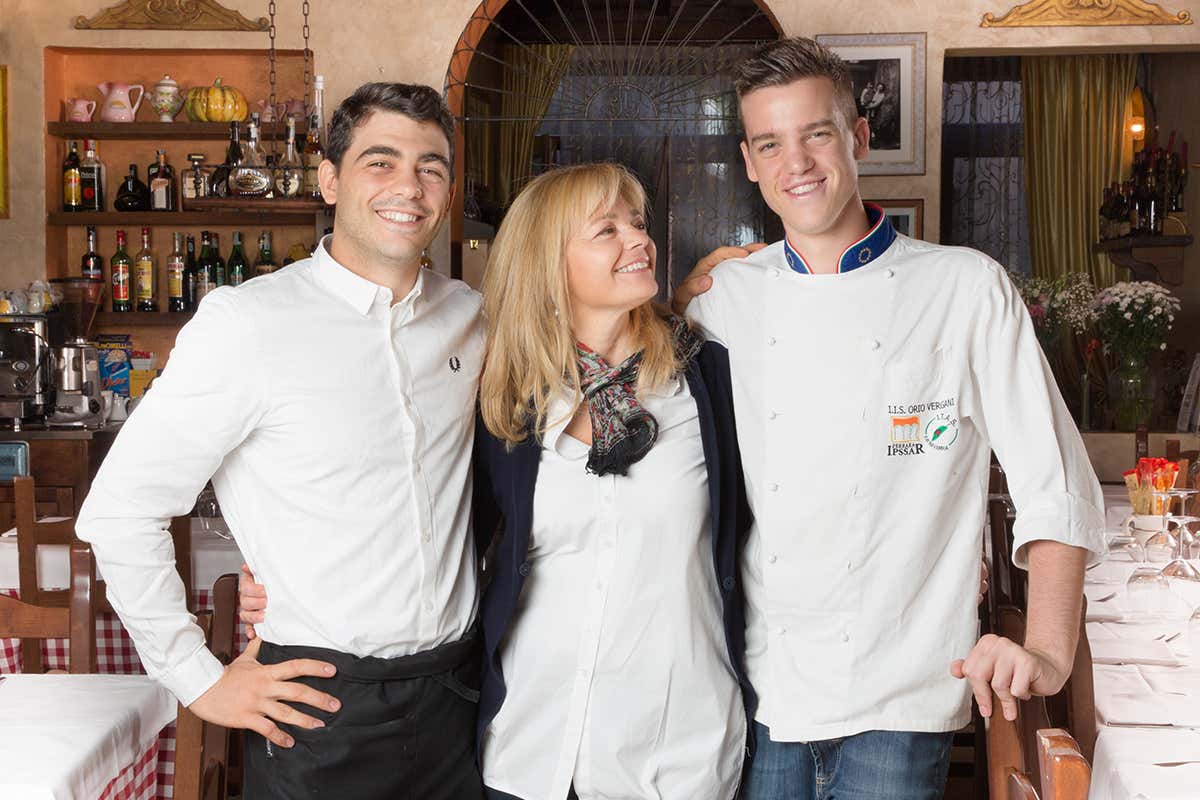 Con i figli Luca Matteucci, sommelier (che si occupa del servizio in sala, del vino e dei distillati), e Giovanni Matteucci, cuoco. Ed è proprio con l’arrivo di Giovanni, diplomatosi alla scuola alberghiera prima e ad Alma a Colorno (Pr), a cui sono succedute esperienza in Piemonte e in Francia, sono stati ripresi piatti che erano stati dimenticati della cucina dell’epoca degli Estensi, come il cappone ripieno, il piccione, la faraona.