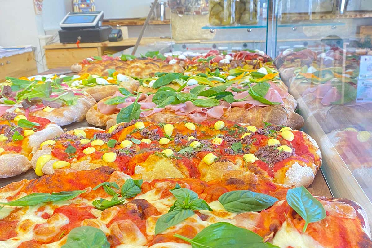 Alice ci elenca i vari assaggi come il trancio di pizza in pala, i frittini casalinghi, la giardiniera fresca locale e stagionale, anche da portare a casa, i carciofini e le zucchine sott’olio, la pizza fritta, la pizza la padellino al vapore. Matteo ci spiega che usare il lievito madre richiede molta attenzione e sensibilità all’ambiente, al meteo e alla materia prima, la farina. Va trovato il giusto equilibrio fra l’aggiunta di acqua e il raggiungimento della digeribilità del prodotto. Il padellino al vapore ne è il perfetto esempio, perché l’impasto fa una doppia fermentazione e la cottura al vapore, doppia anch’essa, conserva al massimo le caratteristiche dei fermenti e della farina dando vita a una crosta croccante e finissima con una mollica molto soffice che ha perso la sua umidità. La pizza al padellino viene servita o farcita sopra o spaccata e farcita all’interno. Potrete gustare il lonzino stagionato in loco, lo stracchino e formaggi dei casari artigiani dei Monti Sibillini, ciauscolo spalmabile e le immancabili giardiniere.