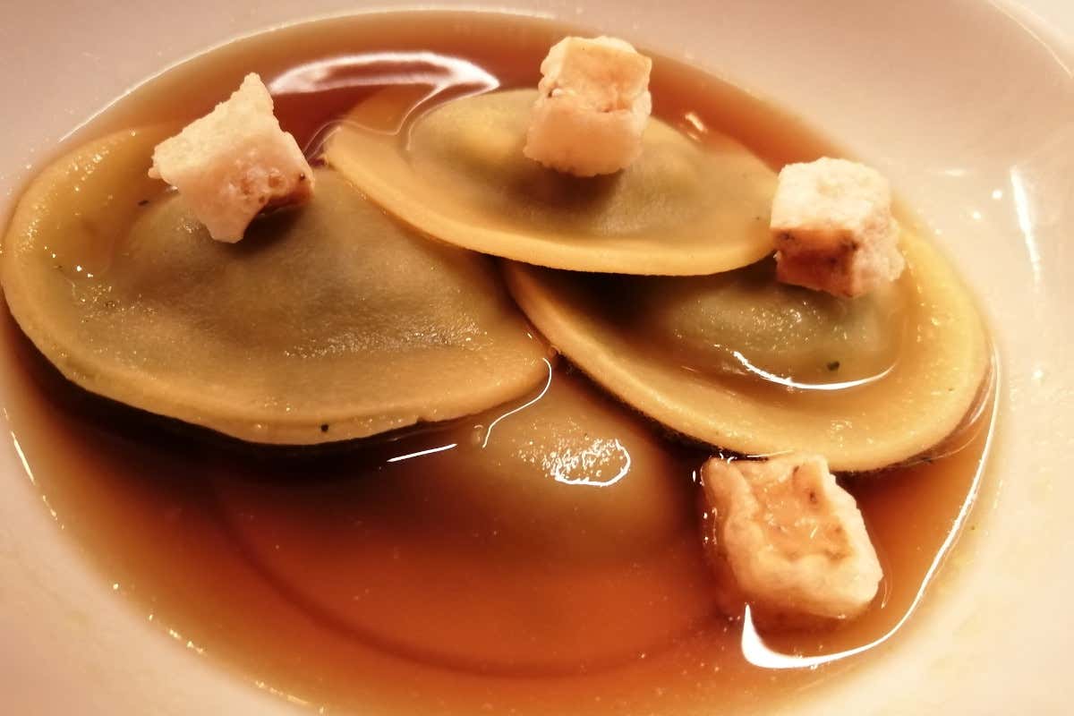 Tortello di ribollita in consommé di cipolla arrostita A Roma “Verso” l'enoteca con grande