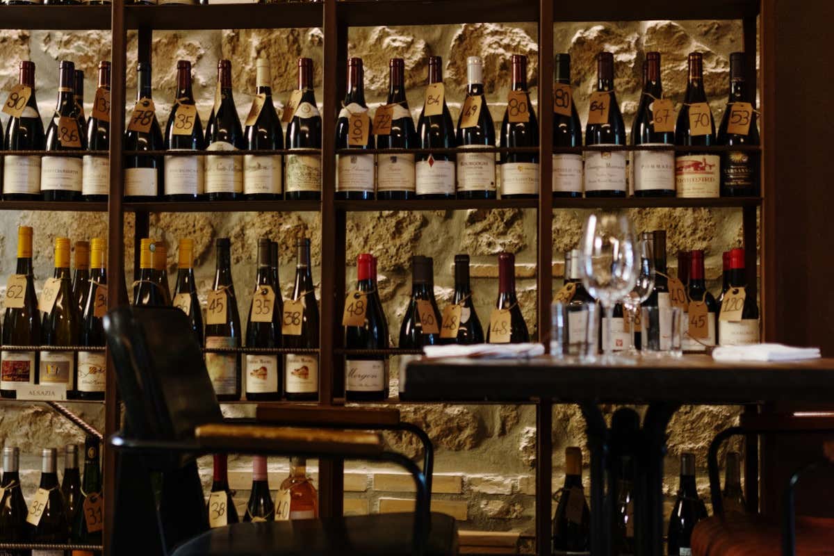 Doveva essere, ed è ancora, un luogo informale e funzionale, senza inutili distrazioni visive con orpelli o decorazioni, con tavoli e sedute comode. Un'arcata separa le due sale dalle pareti di mattoni e ad attrarre lo sguardo sono le grandi scaffalature, come biblioteche, con un migliaio di bottiglie. C'è quasi una geografia di etichette, ognuna con il bene in vista perché la politica del locale è proprio quella di dare il meglio ma senza ricarichi eccessivi e perché il buono deve essere anche accessibile. Si possono portare a casa o consumare al tavolo, con minimo sovraprezzo, e la scelta al calice è davvero ampia.