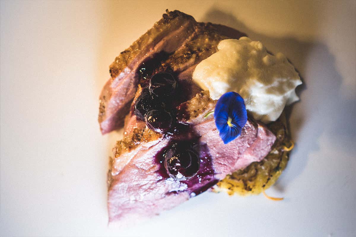 Petto di anatra cotta a bassa temperatura e arrostita con mirtilli e sifonato di Grana Padano Dop oltre 20 mesi