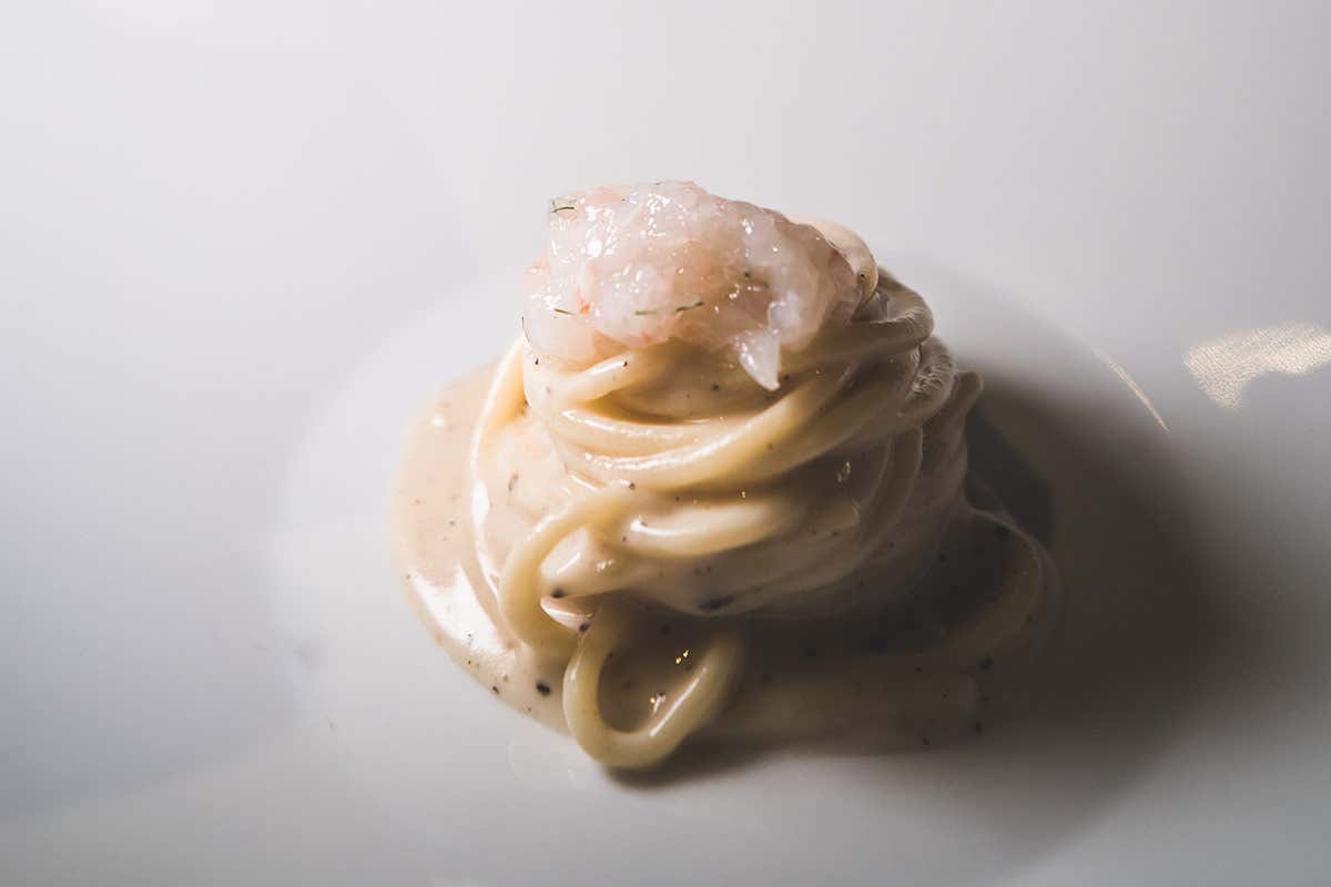 Spaghettone di Gragnano Grana Padano DOP 24 mesi, pepe e crudo di scampi