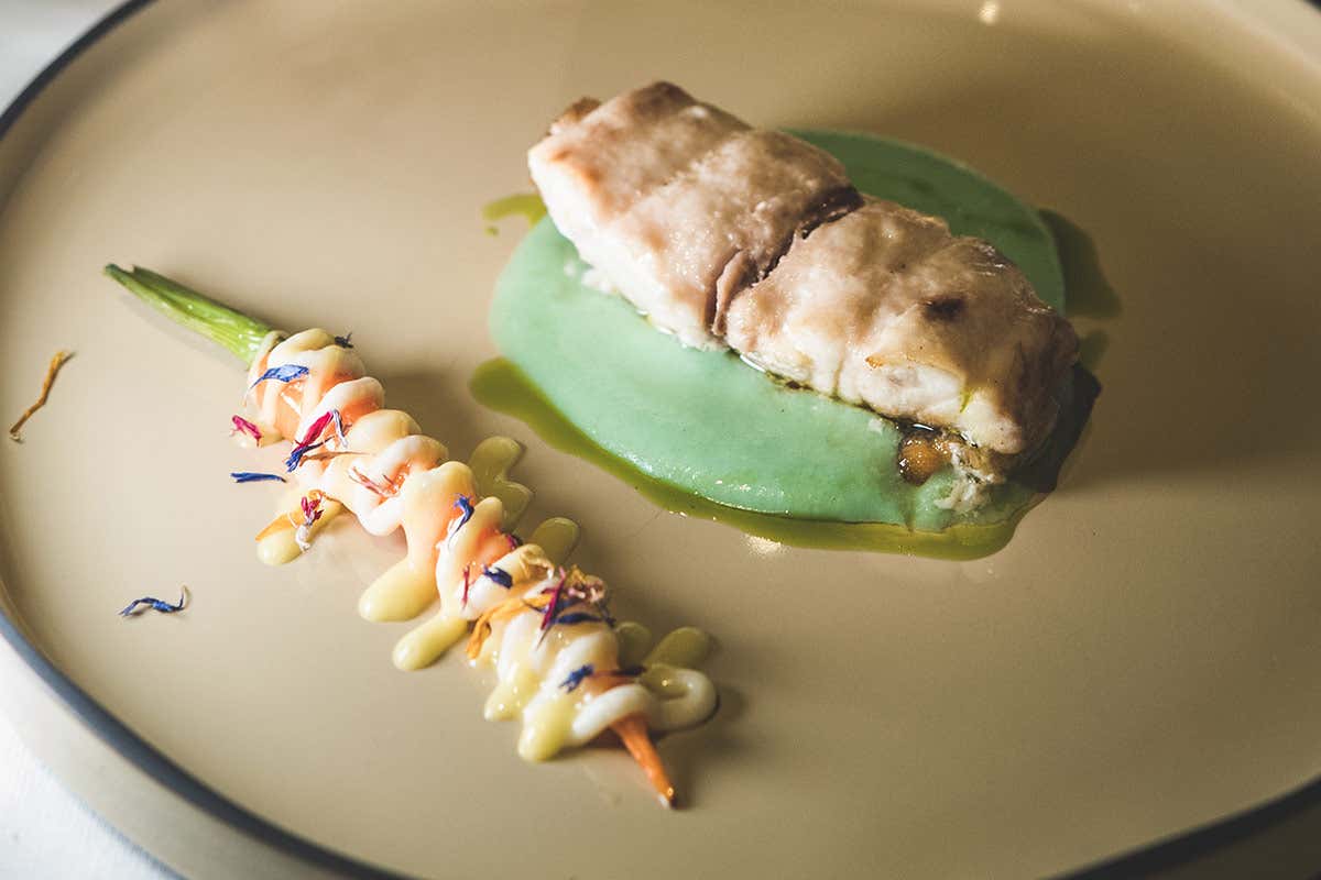 Ombrina in doppia cottura e crema di Grana Padano DOP 18 mesi, carote baby con latte di cocco al limone e purea di mela