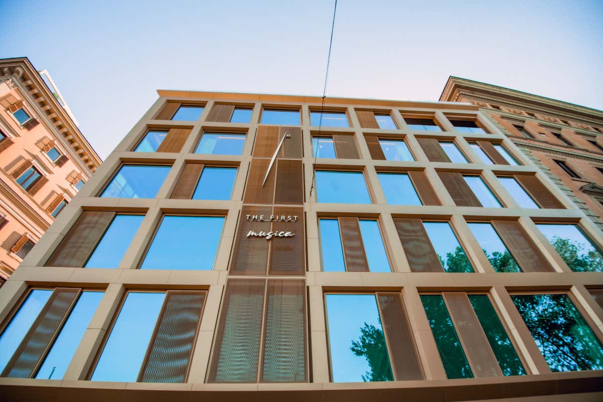 Un progetto di riqualificazione e valorizzazione dello stabile che fa oggi apparire l’edificio del The First Musica come uno scrigno trasparente di grande impatto visivo che in determinate ore del giorno riflette una luce color oro che richiama l’Ara Pacis, l’antico monumento dei tempi dell’imperatore Augusto che sorge sul lato opposto del fiume, proprio di fronte all’albergo.