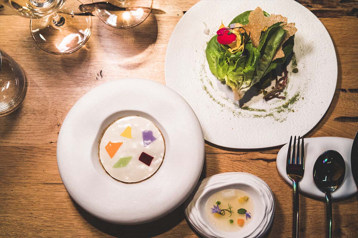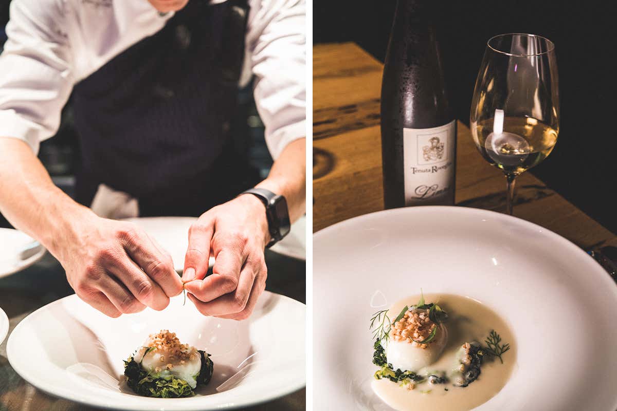 Spazio quindi per le creazioni di Viviana Varese, si parte con un fresco benvenuto della cucina e poi subito l’antipasto: “Viva l’autunno | Uovo con verdure di stagione, broccolo, grano saraceno soffiato e fonduta di Grana Padano Dop 18 mesi ed erbe aromatiche”. Cremoso e piacevole, dolce e amaro, contrasti e consistenze abbinate al “Limne” Lugana Doc 2021 di Tenuta Roveglia.