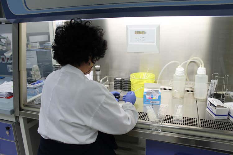 Un'operatrice al lavoro nel reparto di Microbiologia del Papa Giovanni XXIII