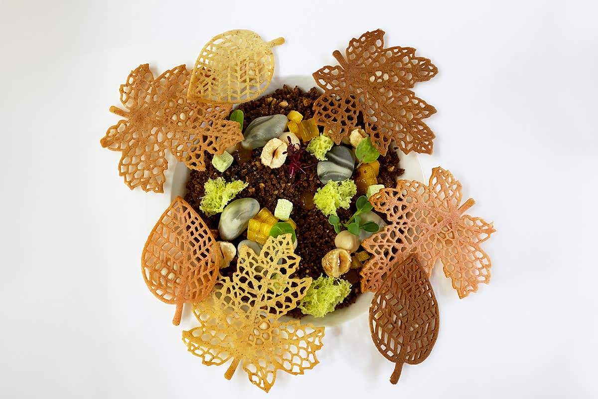 Il dessert Autunno presenta un crumble al cacao che richiama il terreno autunnale, decorato con sassolini di cioccolato, nocciole e ciuffi di spugna verde e marshmallow al prezzemolo [...]
