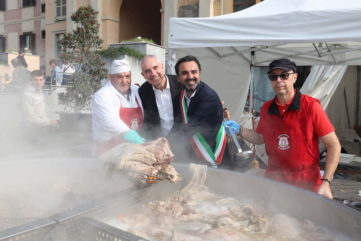 Il clou della giornata di sua maestà il Bollito, però, è proprio lui, protagonista fin dal primo mattino, quando parte la cottura di 1.500 kg di tagli stupendi di carne appunto per bollito, bovina (punta, caramella, muscoli, cappello del prete, testina, lingua) e suina (cotechino), che cuociono nello stesso Pentolone della Fiera Trippa che si è svolta nel medesimo posto due settimane prima. Da dietro le transenne (per motivi di sicurezza) per tutto il tempo si può curiosare la cottura magistralmente condotta dagli esponenti dell’Associazione Macellai di Moncalieri, depositari di una tradizione antica che persegue l’alta qualità delle carni. Alle 12 inizia la distribuzione alle persone presenti che si sono procurate il tagliando all’apposita cassa in loco, che da diritto al ritiro di una porzione di Bollito Misto con bagnetto verde, pane, 1 bicchiere di vino o 1 bottiglietta d'acqua, dolce, al costo di 13 euro a persona (sino ad esaurimento). Per chi lo desidera, esclusivamente però portando un proprio contenitore o pentola (c’è nessun contenitore da dare in fiera) è possibile l’asporto della propria porzione.