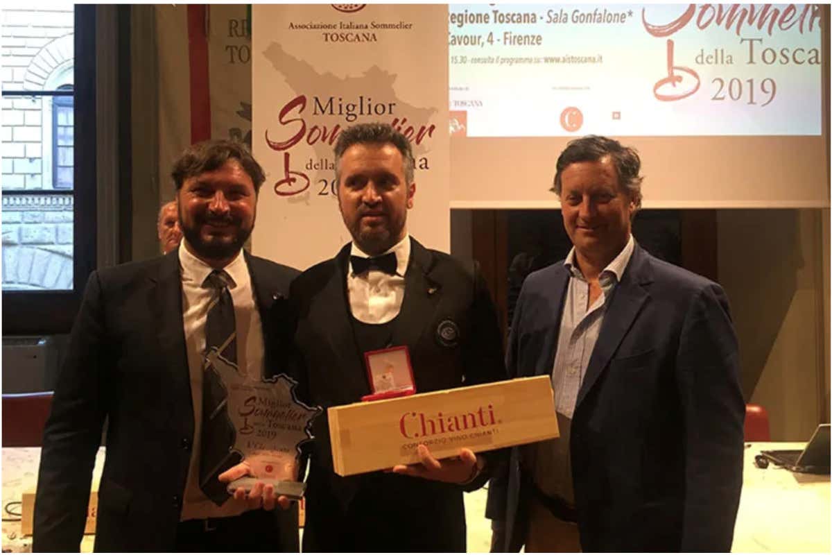Valentino Tesi, miglior sommelier toscano 2019 con Cristiano Cini, Presidente AIS Toscana e Giovanni Busi, Presidente Consorzio Vino Chianti