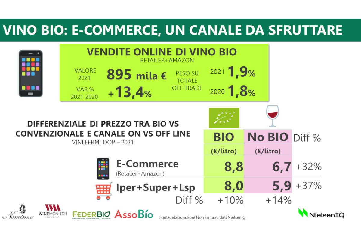 Degno di nota è poi l’e-commerce: nonostante l’online rappresenti appena il 2% del canale off-trade e le vendite abbiano decelerato rispetto al boom del 2020, gli acquisti online continuano a crescere a doppia cifra (+13,4% rispetto al 2020) e ad orientarsi su prodotti di fascia di prezzo superiore. Il differenziale rispetto al vino bio venduto negli scaffali di iper e supermercati è difatti del 10%.