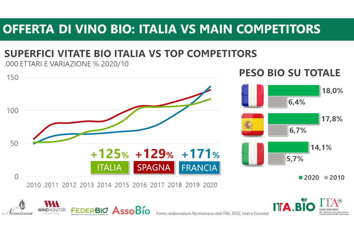 Il vino biologico è un fenomeno - almeno sul fronte produttivo - tutto europeo: l’Unione Europea - con 398 mila ettari nel 2020 - rappresenta ben il 79% della superficie vitata bio del mondo. La leadership dell’Europa si segnala anche attraverso l’incidenza delle superfici vitate bio sul totale, che nel 2020 ha superato il 12% a fronte di una quota mondiale del 7%. In tale scenario l’Italia (117 mila ettari di vite con metodo biologico) detiene, insieme alla Francia, il primato per incidenza di superficie vitata biologica: 18% del totale. La concorrenza europea è però agguerrita: nel giro di un decennio le superfici bio in Italia sono cresciute del +125% (2020 vs 2010) contro il +129% degli spagnoli e ben il +171% messo a segno dai cugini francesi.