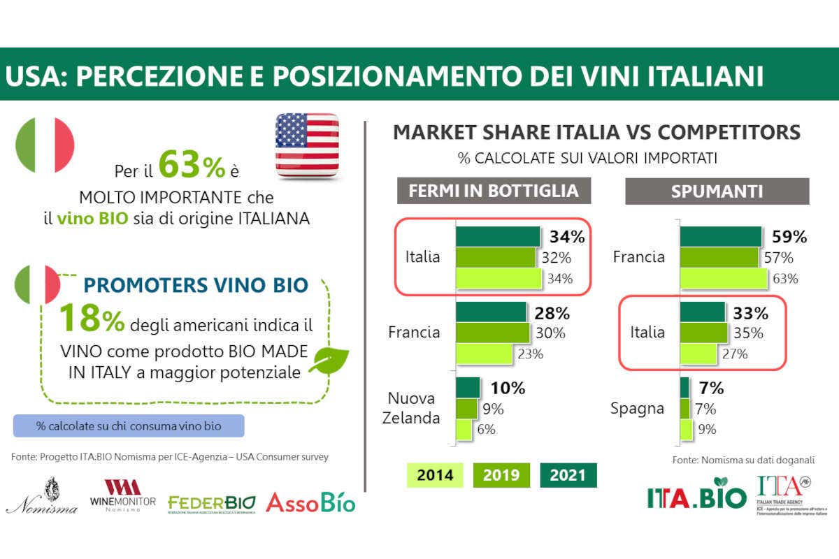 «E sono proprio gli Usa, il mercato a maggiore potenzialità per il vino bio italiano: primo consumatore di vino al mondo e primo destinatario dell’export vinicolo italiano, dove ben 1 consumatore su 3 (parliamo di circa 65 milioni di persone) beve vini biologici» dichiara Emanuele Di Faustino, Senior Project Manager di Nomisma. «Un’ottima opportunità per le aziende italiane alla luce sia dell’elevata capacità di spesa degli americani sia dell’ottima percezione di cui godono i vini bio made in Italy: per il 63% dei consumatori statunitensi è infatti molto importante che il vino bio sia di origine italiana e il 18% indica proprio il vino come il prodotto bio made in Italy a maggior potenziale sul mercato Usa».