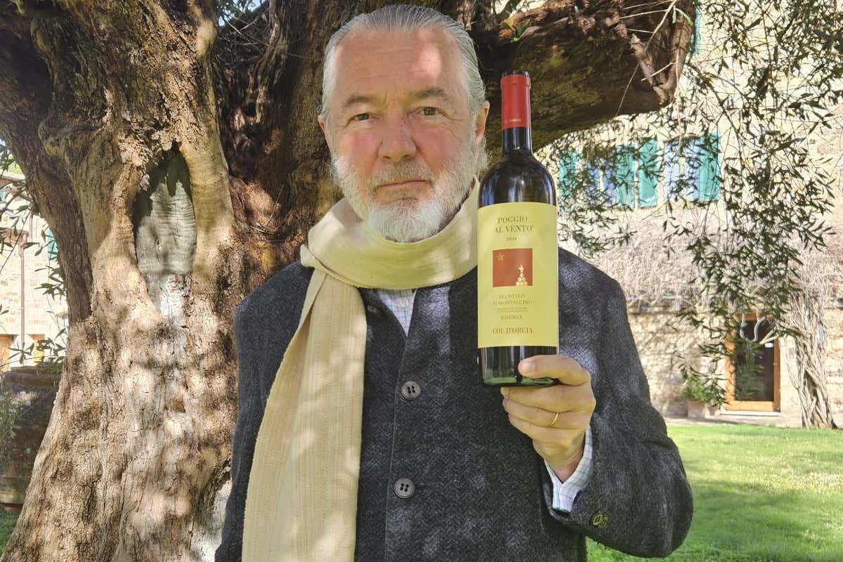 Il conte Francesco Marone Cinzano mostra il Brunello di Montalcino Riserva Poggio al Vento 2016 di Col d‘Orcia