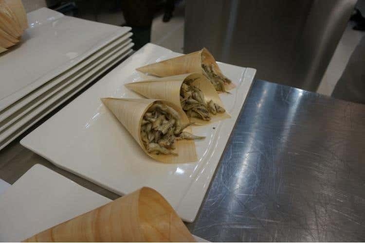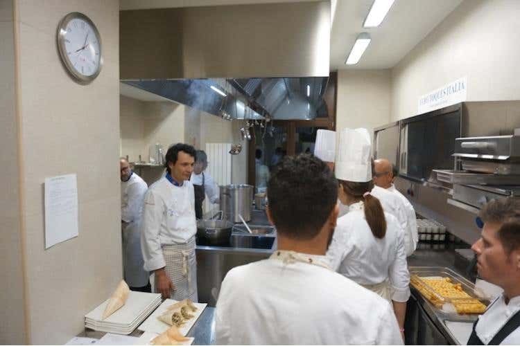 Dopo un aperitivo con Le panelle, Crema di castagna con spuma al cacao e fonduta di caprino, Risotto da passeggio, Acquadelle fritte, Padelline di polenta e missoltini, Mandorla con pelle e pelata Almondeli, ecco che la cena prende ufficialmente il via con il Carpaccio di astice con sgonfiotto di maionese e bianco di pomodoro, sedano croccante, olive e crescione, firmato da Claudio Sadler. Segue il Risotto “Regina Vittoria” con gamberoni rossi, RosaMaria e timo, ideato da Enrico Derflingher. Si passa al Filetto di capriolo con crema di zucca e cime di rapa, opera di Giancarlo Morelli. Per terminare con la Crema al limone e mentuccia di Enrico Derflingher e dulcis in fundo La “mia” Savoia targata Filippo La Mantia.