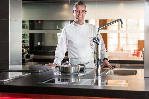 Karlheinz Falk, cuoco del ristorante Olivi dell'Hotel Terme Merano, propone una cucina altoatesina, mediterranea e francese, per accontentare tutti i palati. Sì a prodotti freschi e a ricette gluten free