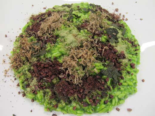 La creatività e la fantasia dello chef unita alla conoscenza storica delle ricette del territorio della solare Irina Freguia, anima del luogo, hanno dato vita a piatti molto particolari: il Tacos Veneziano, chevice di ombrina su radicchio di Chioggia con erbe della laguna e della barena; il risotto Camuflage, Carnaroli mantecato con crema di erbe di campo, polvere d’erbe di barena, tartufo nero e fave di cacao, le seppioline alla plancha, salsa al nero, crema di piselli e pomodorini arrostiti e come dolce la Polvere di biscotto al burro salato, crema di mele Pink Lady e ricotta alla vaniglia di Tahiti. Sono piatti che odorano di laguna grazie alle diverse erbe, come la salicornia, la porcellana di mare, già conosciute dai Vichinghi, che tornano nella cucina di Daniele e che rendono la sosta al Vecio Fritolin un’esperienza gastronomica stimolante.