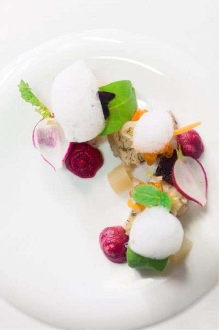 Salmerino alpino in carpione leggero alle mele, rafano, rape rosse