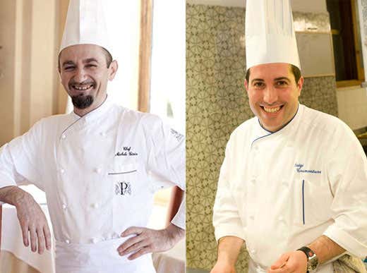 La valorizzazione dei prodotti del territorio unisce l’arte culinaria di Luigi Tramontano (nella foto, a destra), cuoco della Terrazza Bosquet di Sorrento alla fantasia creativa di Michelino Gioia (nella foto, a sinistra) de La Posta Vecchia Hotel di Palo Laziale (Roma). È questa “Chef a 4 mani”, la piacevole sintesi della serata da non perdere in programma venerdì 28 agosto al ristorante “The Cesar” de “La Posta Vecchia”, quando i due cuochi (entrambi con stella Michelin) proporranno il seguente menu: Aperitivo (Michelino Gioia), Profumo di mare (Luigi Tramontano), Capesante, galletta croccante, mela e patate affumicate (Michelino Gioia), Soufflé e carpaccio di parmigiana di melanzane con polpettina fritta (Luigi Tramontano), Astice, ostriche, limone candito e aneto risotto (Michelino Gioia), Involtino di rana pescatrice con erbe mediterranee, gamberi rossi e pomodori confit (Luigi Tramontano), Ciliegia al porto, caffè, cocco e liquirizia (Michelino Gioia).