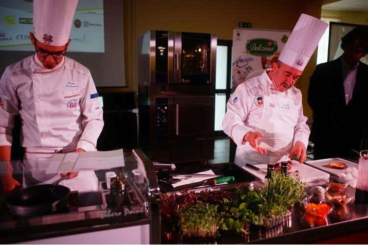Questa mattina all’istituto alberghiero “Marchitelli” si sono alternati in show cooking, oltre a Niko Romito e all’emergente Daniele D’Alberto, altri chef stellati abruzzesi: Marcello e Mattia Spadone (La Bandiera), Peppino e Arcangelo Tinari (Villa Maiella), accanto ai colleghi pugliesi, tra cui Michele D’Agostino, presidente regionale dell’Unione cuochi pugliesi, e ai cuochi del Team Abruzzo.