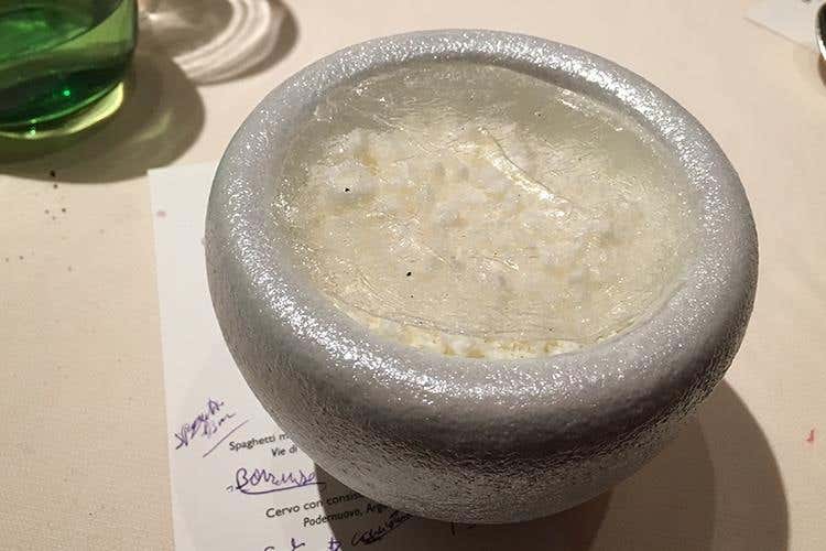 Podernuovo, Argirio, 2011, che ha poi ceduto il passo ad un dessert in cui latte pastorizzato preparato in tre modi diversi ha piacevolmente sorpreso i commensali. Il dolce era accompagnato da
