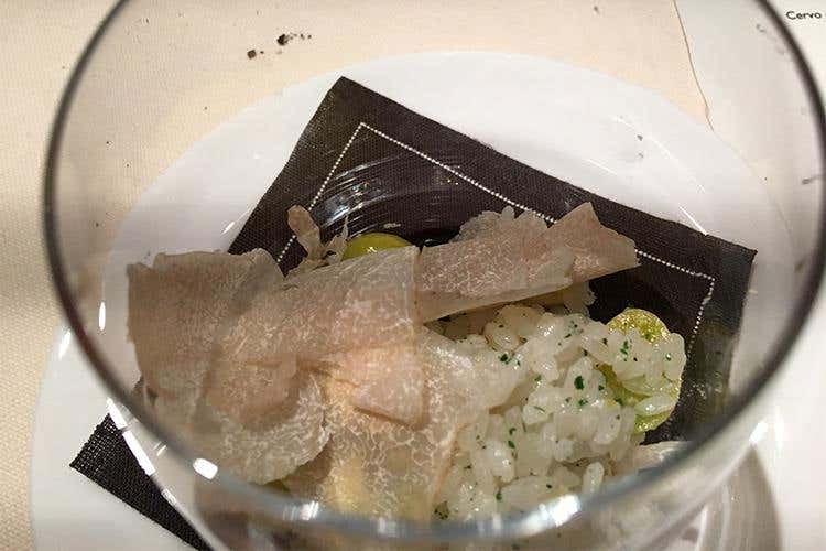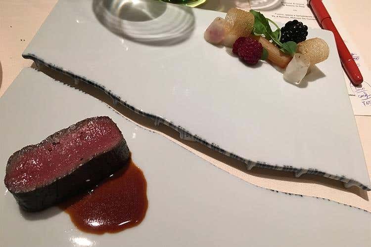 Ugualmente di spessore il Riso, fave castagne e tartufo bianco, dove l'accostamento di varie tecniche di cottura e di ingredienti al cui abbinamento non siamo magari abituati, è stata una vera sorpresa. In questa prospettiva si è collocato anche il Cervo con consistenze di scorzanera, accompagnato da
