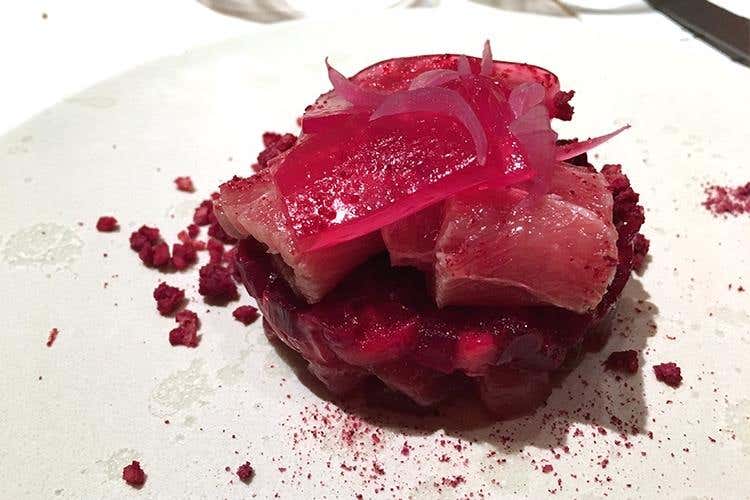 Il primo piatto di Fantin era quindi un Tonno, spezie e barbabietole rosse, accompagnato da