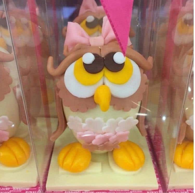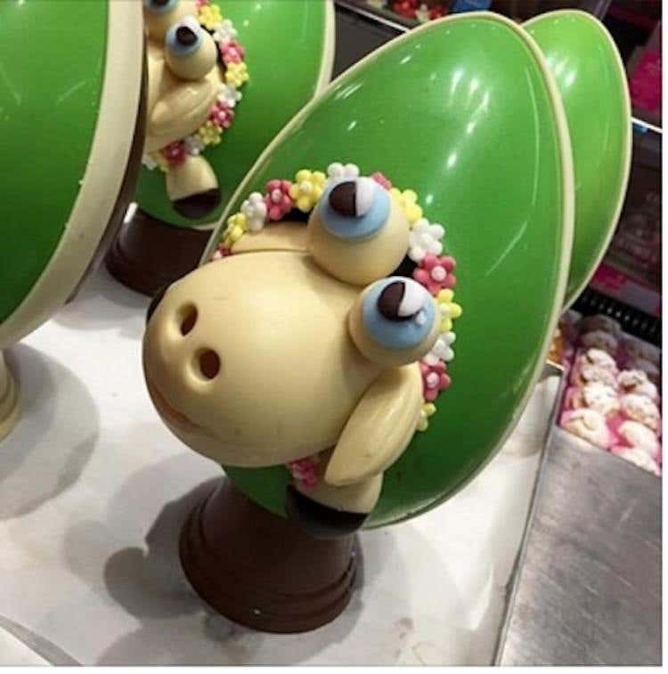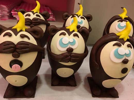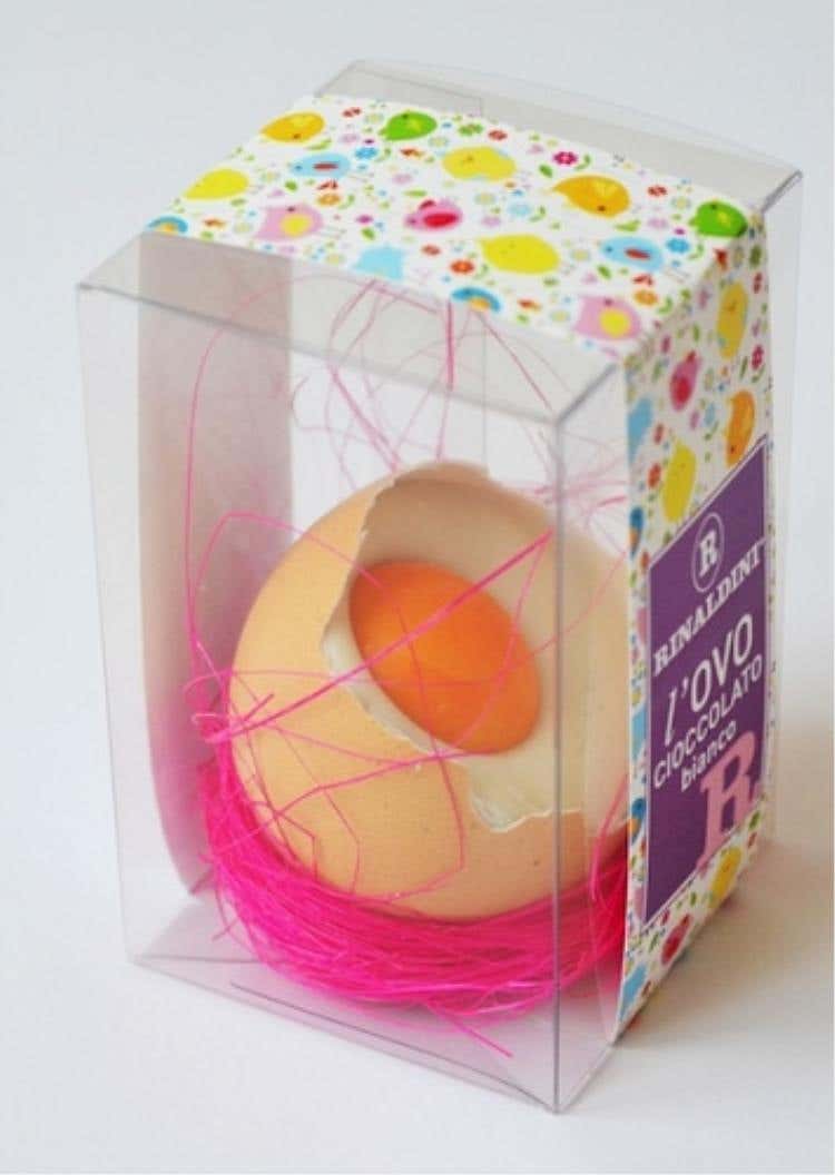 Le uova di cioccolato sono proposte in varianti quanto mai originali, decorate artisticamente a forma di gufi, scimmiette “non parlo, non vedo e non sento”, apine, mucche muh e altri fantasiosi soggetti pasquali. Da non dimenticare due grandi classici dell’estro del Maestro pasticcere: l’uovo all’occhio di bue realizzato con delizioso cioccolato bianco; l’”Ovo”: dove racchiusi in un vero e proprio guscio sterilizzato, il cioccolato bianco, quello al latte e quello fondente emulano in modo perfetto, ma dolce, l’uovo alla coque.
