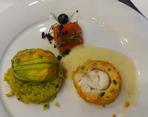 Trancio di baccalà con pane croccante al pomodoro e arancia, crema di cipolla e patate; Sformatino di zucchine ed il suo fiore con baccalà mantecato; Trota salmonata marinata con insalatine, germogli ed emulsione al rafano