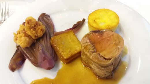 Filetto di vitello in manto di porcini e guanciale affumicato, Tempura di animelle, Tortino di asparagi bianchi, Patata fondente e Radicchio in agrodolce