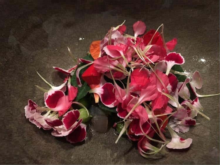 Carote gommose al tè, formaggio di capra stagionato due anni, fiori di finocchio e riduzione di siero di latteAssolutamente piacevoli, oltre che belli da vedersi, ad esempio, gli Asparagi bianchi di Bassano, serviti a bastoncino con porcini, prugne secche e aceto balsamico bianco in gocce assolutamente eleganti e capaci di impreziosire il piatto. Elegantiissmo ed equilibrato anche lo Sgombro salato, limone bruciato, sottaceti e nasturzio, dove la carne quasi cruda e la pelle seccata si occultano fra i fiori soprendendo poi per l'equilibrio che offrono in bocca.