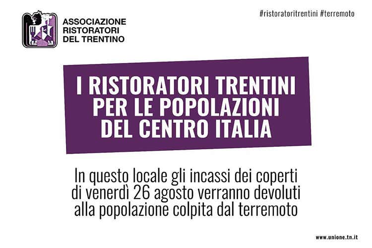 Ammirevole anche l'iniziativa lanciata dall'Associazione ristoratori del Trentino; i locali aderenti devolveranno il ricavato dei coperti di oggi 26 agosto alle popolazioni colpite dal terremoto. «In questo momento drammatico - dichiara il presidente dell’associazione Marco Fontanari - anche i ristoratori trentini hanno avvertito l’esigenza di offrire il loro contributo per prestare i primi soccorsi ai paesi colpiti così duramente dal terremoto. Come è accaduto anche in altre occasioni, l’Associazione, sollecitata anche dagli stessi soci, ha lanciato un’iniziativa di solidarietà aperta a tutti i ristoratori trentini per raccogliere fondi che saranno indirizzati alle operazioni di soccorso di queste ore».