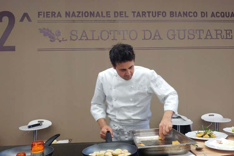 Daniel pone gli gnocchi, le puntarelle appena scottate e ben cotte e, colpo di scena, sul palco salgono Le Signore Trifole con un bel tartufo bianco che inonda la sala. Daniel spiega la sua filosofia e racconta di Milano dove il ritmo enogastronomico del giorno viene scandito dai tempi della metropoli divisi per i tempi della natura. Assaggiamo un piatto complesso e semplice insieme. Molto buono. Gli gnocchi sono saltati sulle padelle Tvs. Che si sono scaldate sulle cucine Pedini della vicina Fano. Il tutto servito grazie a Guzzini e alle sue creazioni. Non è la prima volta per Canzian nelle Marche e non sarà l’ultima.