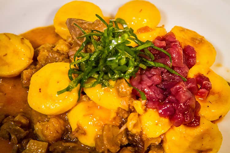 La cena vede i due alternarsi su un palco show coocking. German apre con l’Ascolana di tonno in omaggio alla provincia di origine di Enrico. Che risponde con il suo Tartufino di formaggio. Il percorso continua su crudi di mare e terra. Carpaccio di ricciola per German e Tartare di scottona di razza marchigiana Igp per Enrico. La tartare è quella frollata per 40 giorni dal Macellaio Mauro Follenti di Civitanova Marche. I vini sono ottimi e presentati con passione da Lapadula stesso e dal sommelier Stefano Pirchio. Gli Gnocchi senza patate, piatto vintage di Mazzaroni, stupiscono ancora e piacciono. Così come la Sfera liquida di parmigiano posta sopra un tenerissimo stracotto. Il Polpo a Portonovo di Scalmazzi ci fa sentire odori intensi di mare profondo. Lo chiamerei polpo a Porto Recanati.