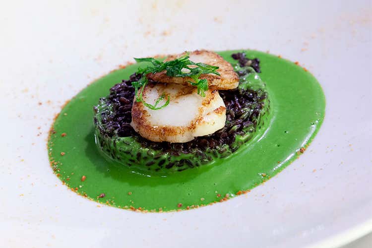 Riso Venere, asparagi e cappesante (Alta cucina al Castello di Spilimbergo Frutto della filosofia di Marco Talamini)