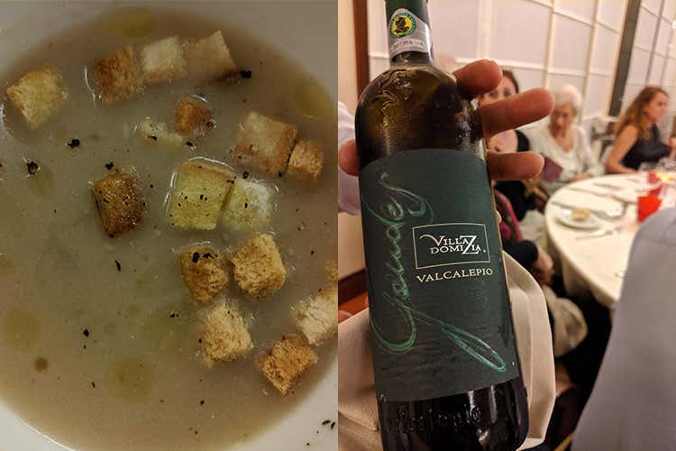 Poi Zuppa di funghi delle Orobie del Ristorante Posta al Castello di Gromo (Bg). Il vino Gaudes Bianco Valcalepio Dop 2017 lo ha fornito l’Azienda vinicola Villa Domizia di Torre de’ Roveri (Bg).