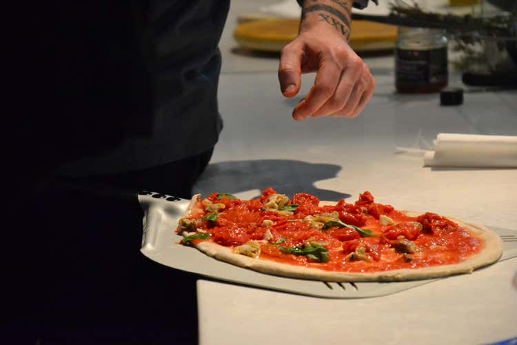 A Rimini, Marasco ha infatti incentrato la prima masterclass sulla rivisitazione di una sua pizza iconica, la Marinara Quattro Pomodori (San Marzano, Antico pomodoro napoletano, Piennolo vesuviano e Fiaschetto pugliese semi-secco), lì eseguita con Vongole Veraci e prezzemolo fresco; mettendo in evidenza il ruolo determinante - oltre all’eccellenza delle materie prime - di un calore di qualità in cottura per avere come risultato un prodotto di alto livello.