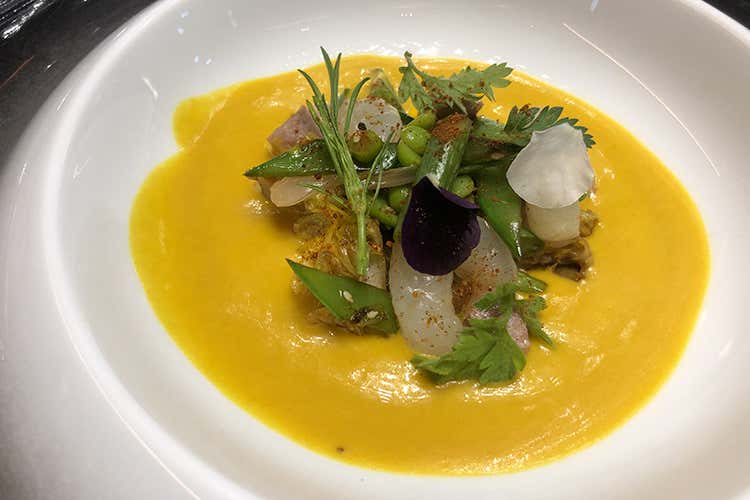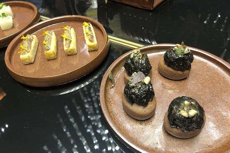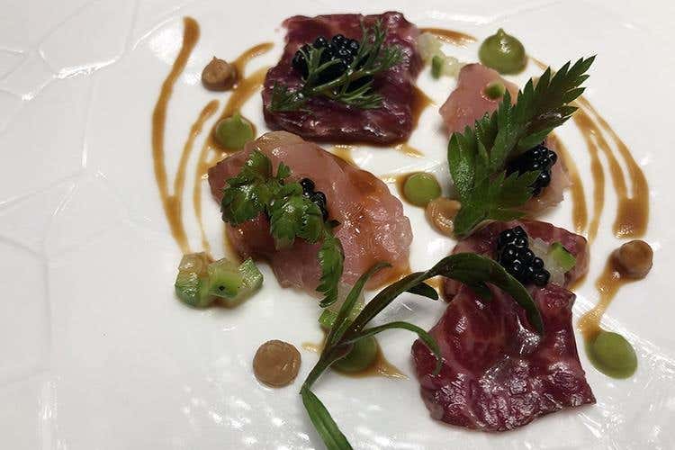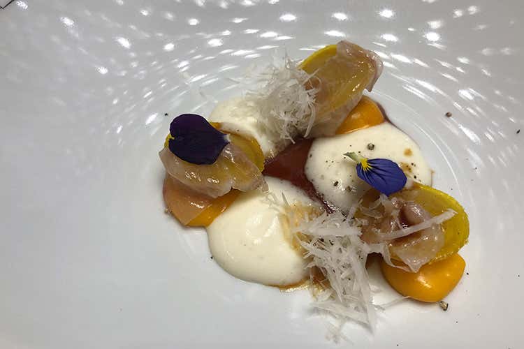 Tre diversi menu, ma uno stile chiaro e inconfondibile, quello di Apreda, quello che «ho immagazzinato in tanti anni di esperienze. Più vado avanti più i miei viaggi sono presenti nella mia cucina, nei miei piatti. È una cucina molto personale, ad esempio spezie ed alghe sono molto presenti, sto usando la sapidità di questi ingredienti per bilanciare i miei piatti, e ora ben metà della mia carta è senza sale aggiunto, non per una questione salutistica, ma per il desiderio di ricercare il sapore autentico dell'ingrediente».